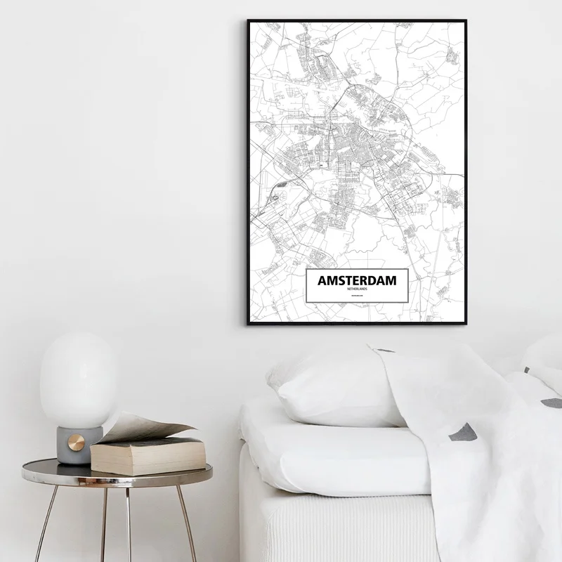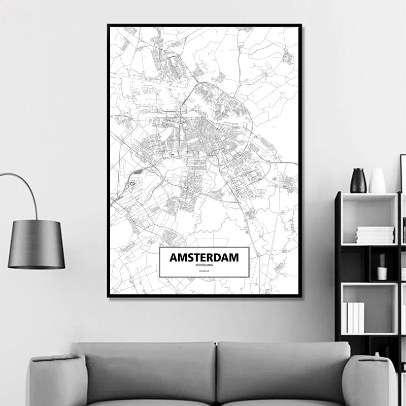 Amsterdam, Netherlands Black White Custom World City Map Poster Canvas Print Nordic Style Wall Art Home Decor