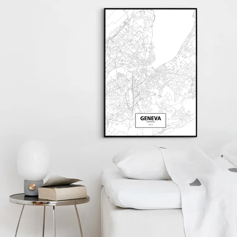 Geneva, Switzerland Black White Custom World City Map Poster Canvas Print Nordic Style Wall Art Home Decor