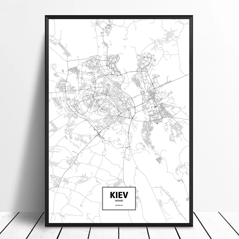 Kiev, Ukraine Black White Custom World City Map Poster Canvas Print Nordic Style Wall Art Home Decor