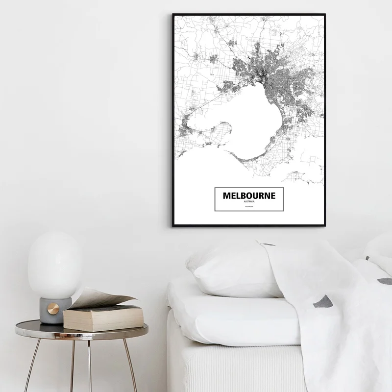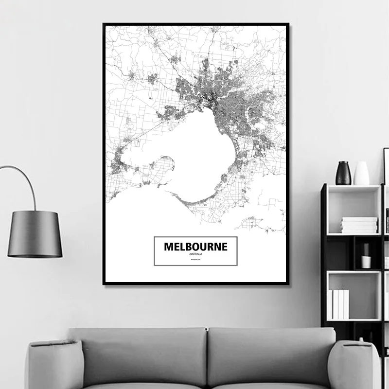 Melbourne, Australia Black White Custom World City Map Poster Canvas Print Nordic Style Wall Art Home Decor