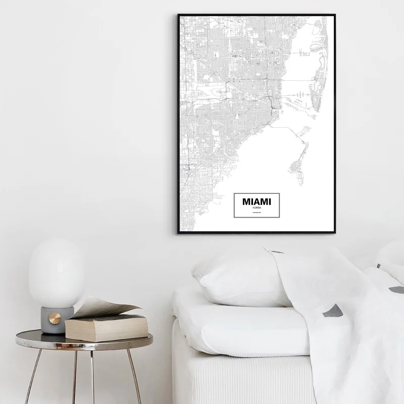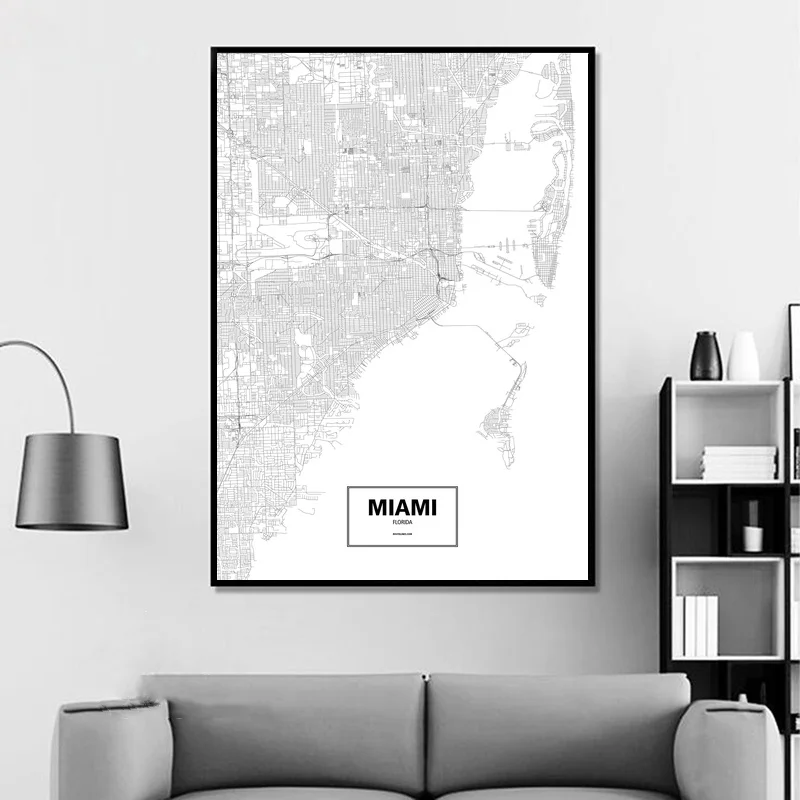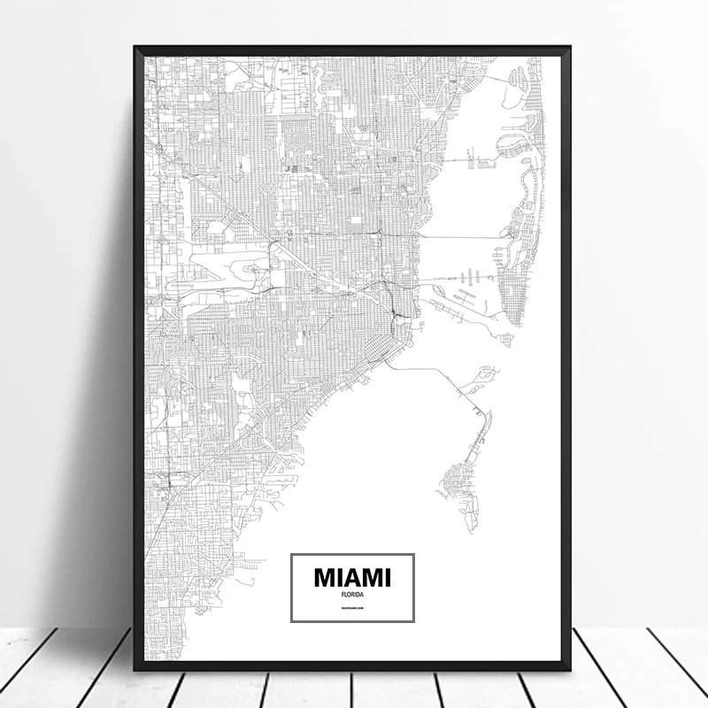 Miami, Florida, United States Black White Custom World City Map Poster Canvas Print Nordic Style Wall Art Home Decor
