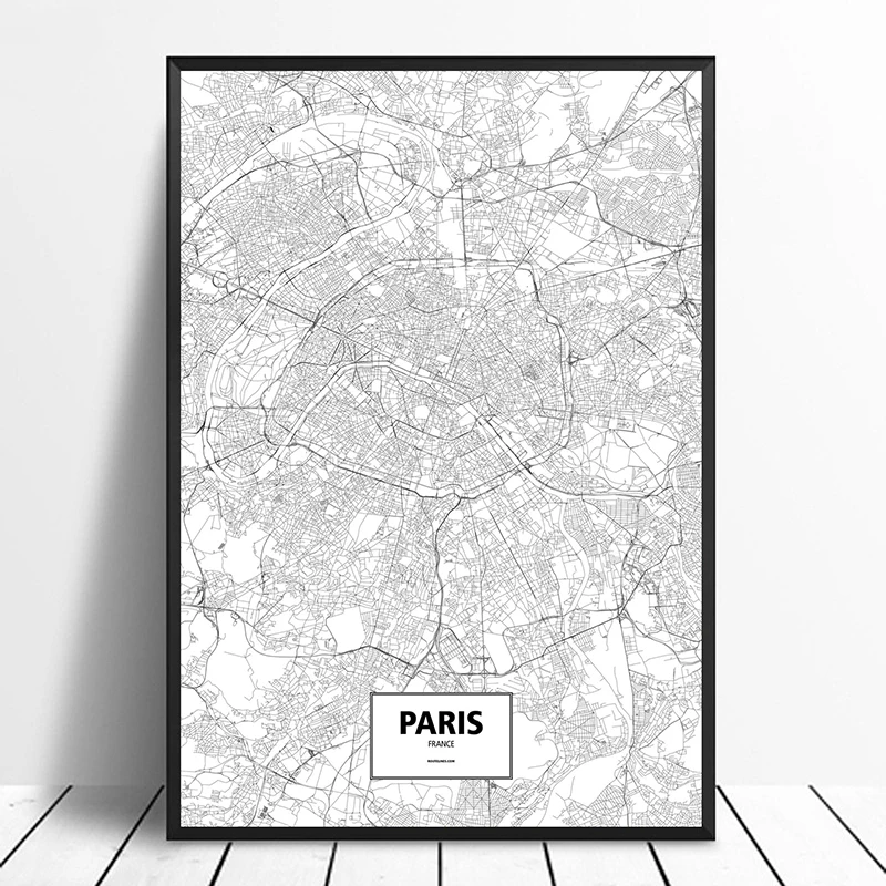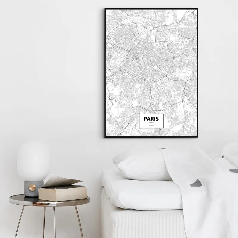 Paris, France Black White Custom World City Map Poster Canvas Print Nordic Style Wall Art Home Decor