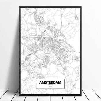 Amsterdam, Netherlands Black White Custom World City Map Poster Canvas Print Nordic Style Wall Art Home Decor